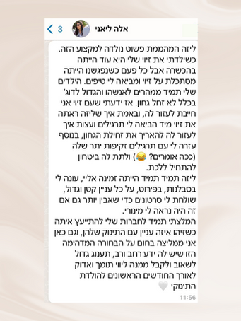 העבודה עם תינוקות ופעוטות ממלאת אותי באושר ושמחה, ואני אסירת תודה ויותר מגאה להגיד שהיום אני מרגישה שהמהות שלי היא חד משמעית לעזור להורים להעצים ולחזק את הביטחון בהורות שלהם, ולסייע לתינוקות ופעוטות להתפתח בצורה המיטיבה והטובה ביותר.